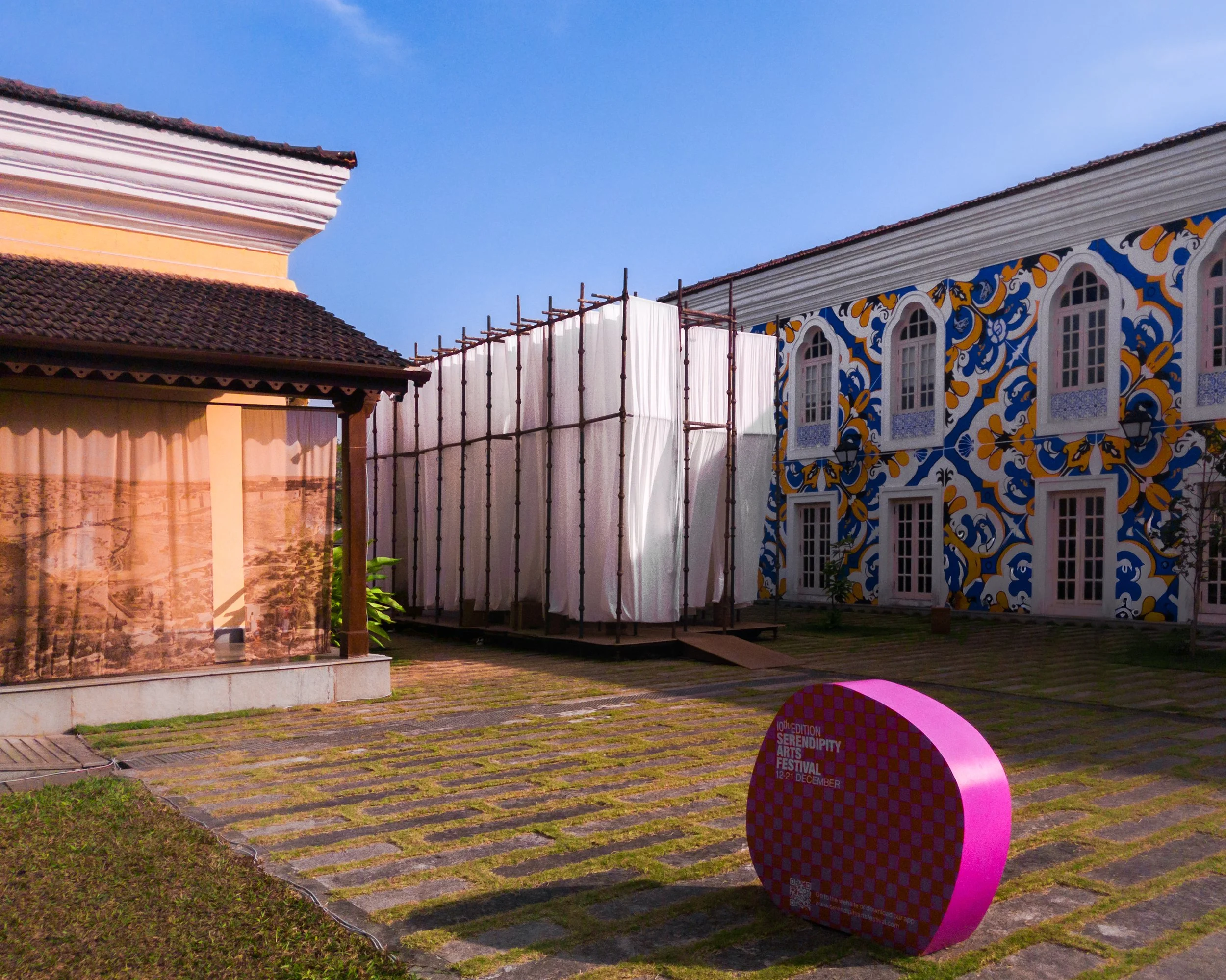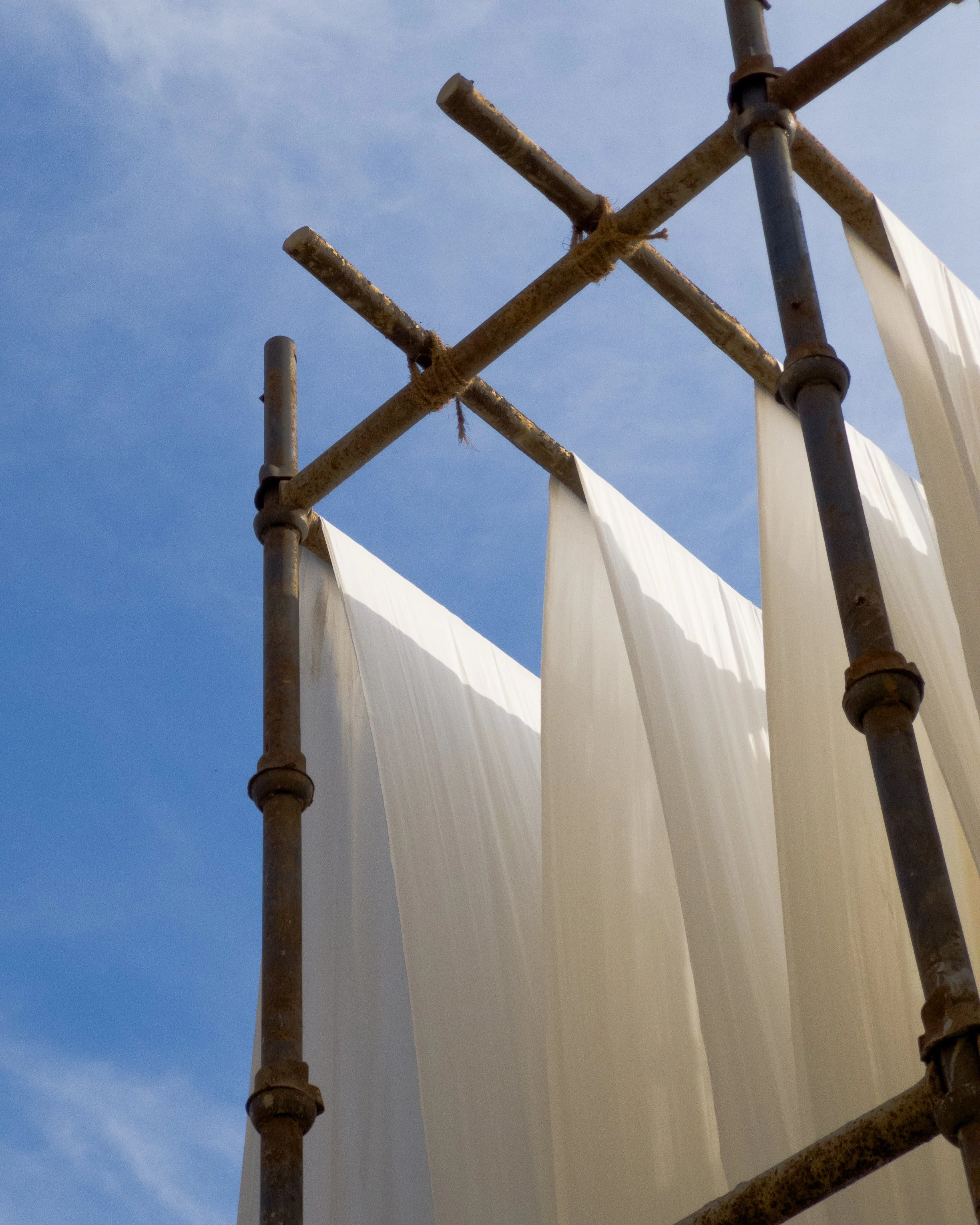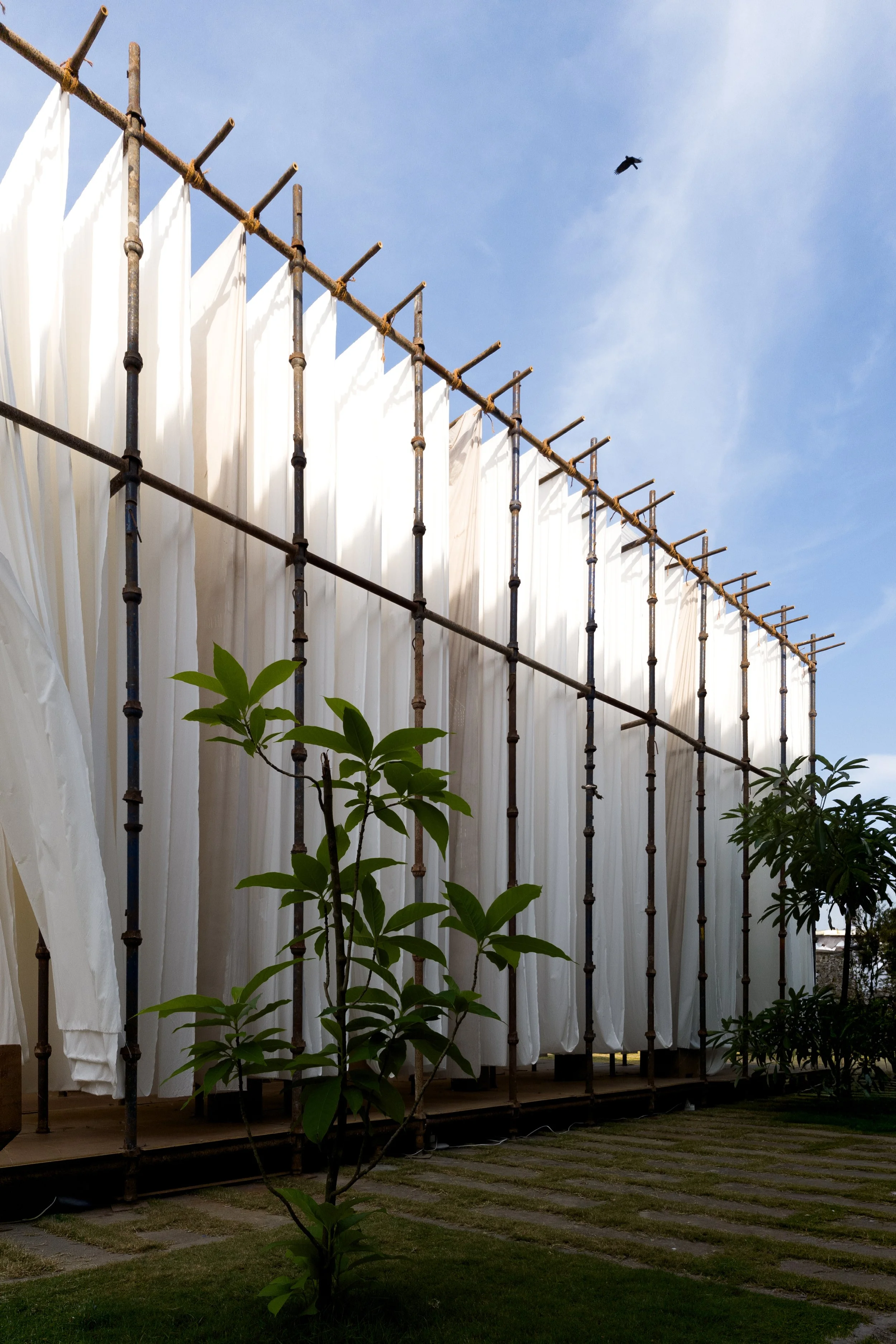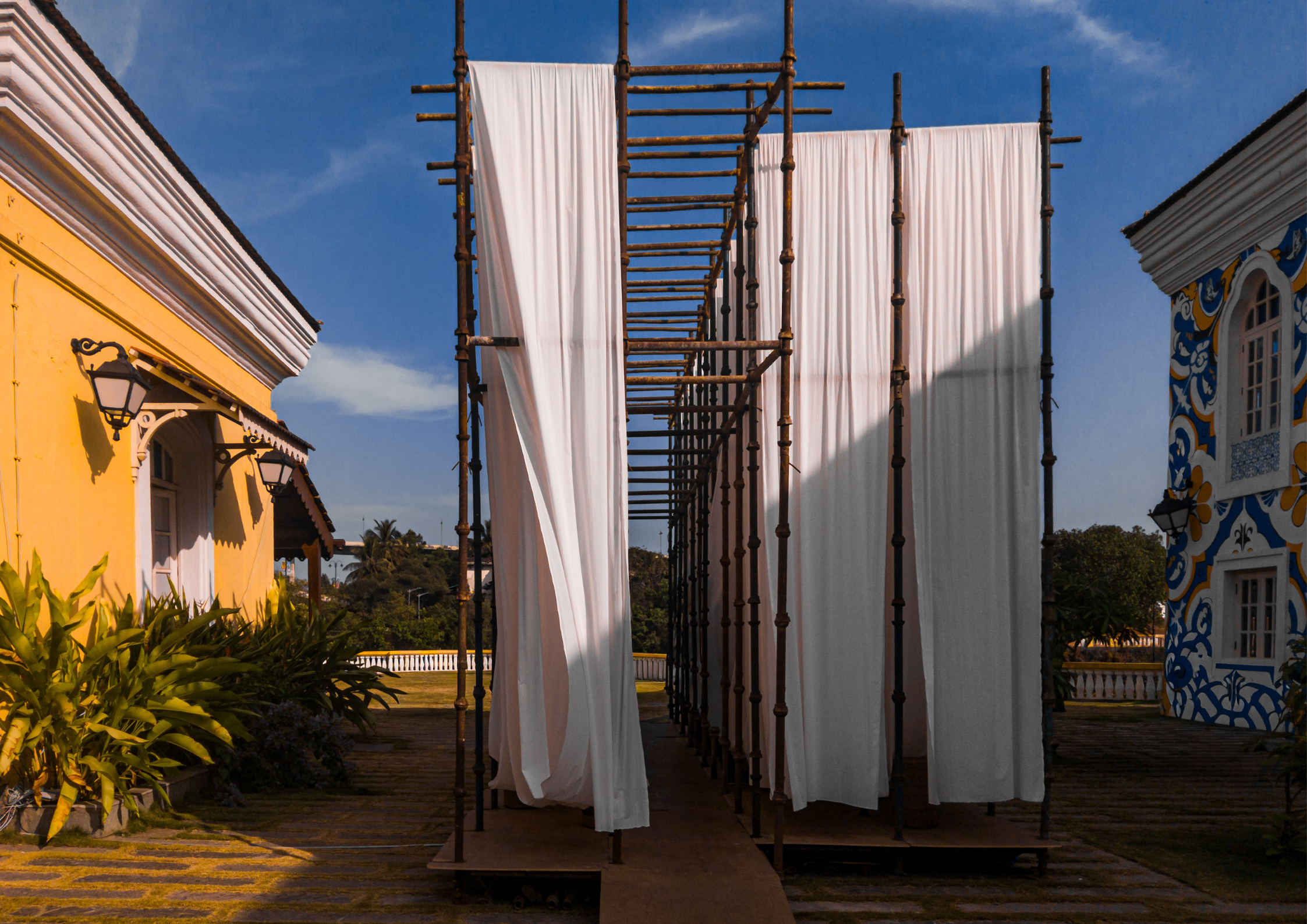 PAUSE is an immersive site-referential installation that was inspired by the witnessing of a daily act of drying natural fabric on a 3-dimensional framework in Rajasthan prior to applying dyes or color. The practice and the resulting artwork thus have its roots in India’s complex and historical association with textiles and the social implications of the industry.