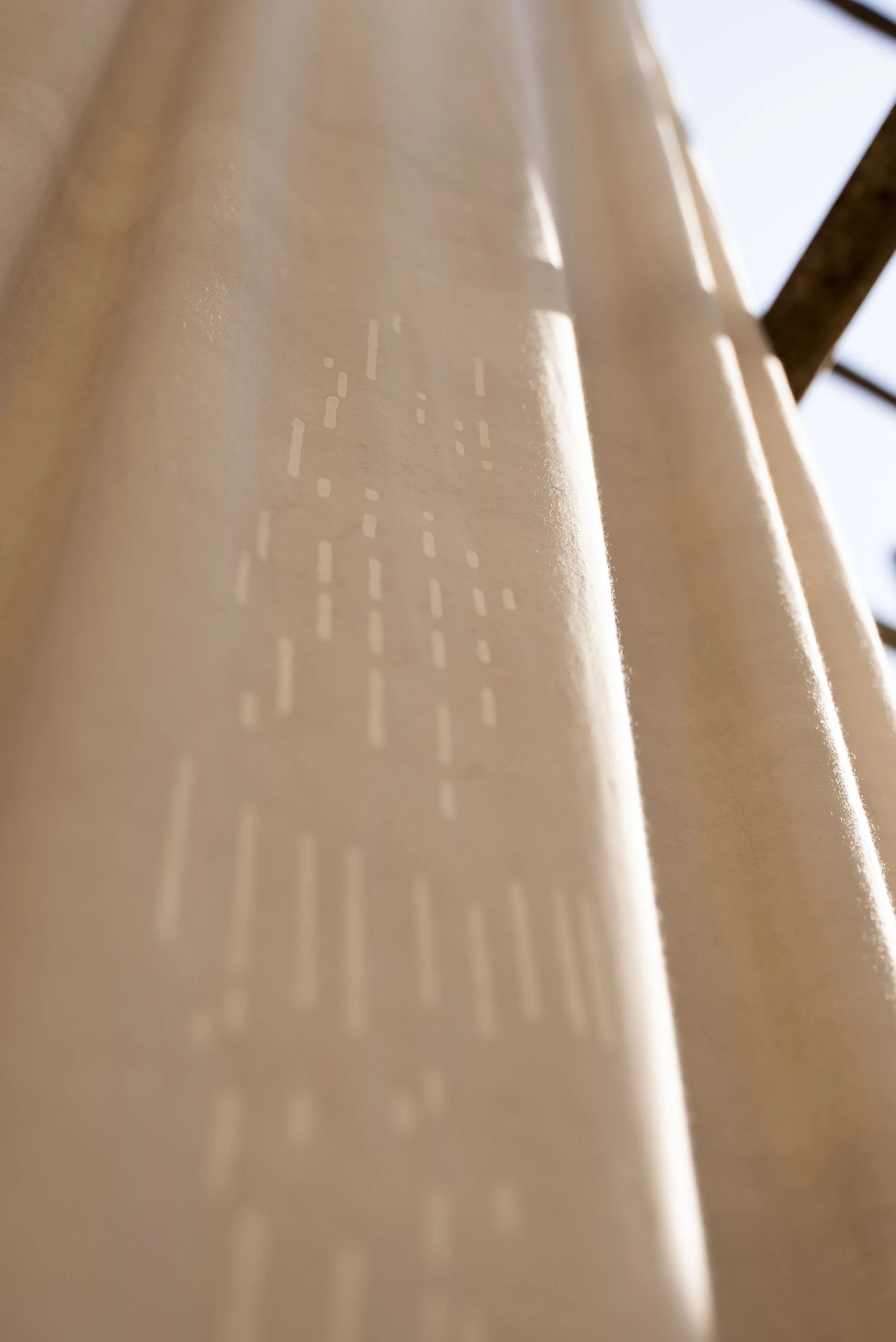 In addition to the bleached fabric, which is randomly marked by block printed notations from the piano roll, the artwork is punctuated with a number of identical cylindrical earth cores made from compacted rammed earth. As a natural material, the earth cores, in many ways in sync with the textile, are alive and breathing. These earth cores offer seating between and next to the aisles of hanging fabric. They are places to offer respite, and to connect - for the individual themselves and communally with the person seated close by.