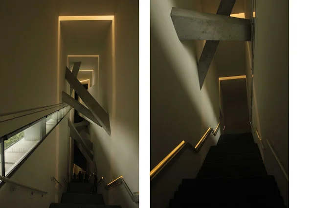 ! This is a big distinction and the reason I say this is two-fold; one is the ability that the built space has to evoke emotional reactions and second is the limitless extent of design thought and detail that has gone into this building. My reaction to this building is contrary to my proponance for minimalism and the idea of keeping design simple and lucid. The Jewish Museum is a severely complex building but the beauty of it is that everywhere you look one is presented with perfect example of design work where complex geometries, materials and play of light are prefectly composed into multi-dimensional multiple frames of architectural space. The typical problem with complexity in design is that buidlings can very easily look over-designed and it is mostly difficult to justify the complexity. Mostly complexity in design makes it difficult for various elements to come together and the core concept or design driver is lost. None of the above are a problem at the Jewish Museum. DL has built a building that is complex yet true to its central design thought, and the building inside and outside leaves a lasting impact on the viewer/ inhabitant. The building has the ability to evoke strong emotional reactions that are linked to the design concepts weaved into the building.