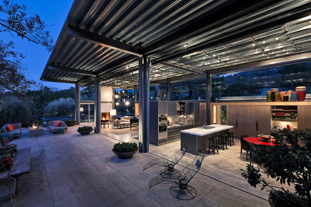 The beauty of this house once again lies in the design of the indoors with the outdoors. The living room once again is designed to completely open to the outside, this time with 20-foot wide steel and glass doors that open mechanically and fit under the roof when opened. In the floorplan, notice how the architect has designed the outdoor terrace to be bigger than the indoor living room clearly indicating the importance of outdoor living.